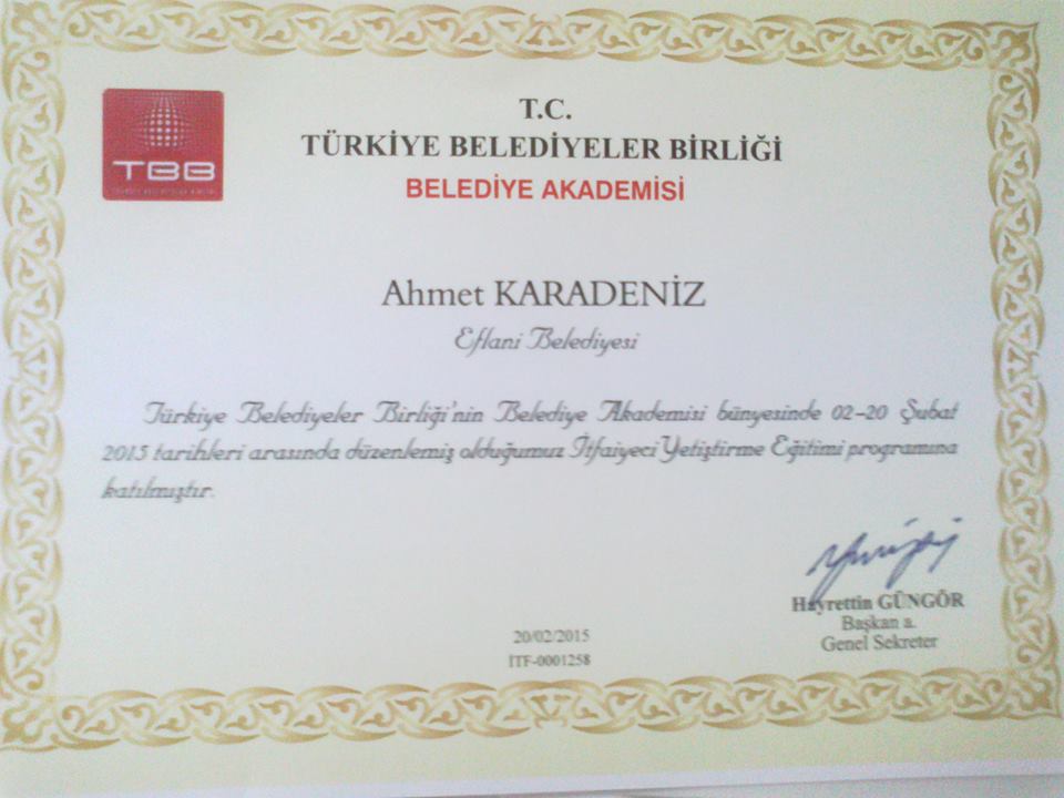 TBB ve KOBİTEM arasında yapılan iş birliği çerçevesinde düzenlenen Temel İtfaiyecilik Eğitimi tamamlandı. Belediyemiz çalışanlarından itfaiye görevlisi Ahmet KARADENİZ' de katılarak 20 gün süren eğitimi başarıyla tamamladı ve İtfaiyeci Yetiştirme Eğitimi sertifikası almaya hak kazandı.